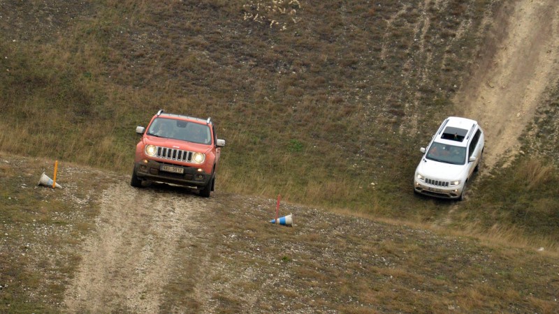 Mindezek a problémák persze egyből feledésbe merülnek, amint terepre tévedünk, márpedig miért ne tennénk, ha már a Renegade-et választottuk. Az esős napon tartott menetpróbán pedig volt alkalma bebizonyítania az autónak, hogy képes a nehéz helyzetekben is helytállni: a mély sártól kezdve a komoly köves-füves emelkedőkön át mindenhol követte nagyobb testvéreit a jármű – még a 100%-os emelkedőt is könnyedén megmászta. A Jeep által hangoztatott állítást – mely szerint kategóriájának legjobb terepképességeivel rendelkezik a Renegade – nem esik nehezünkre belátni. Mindez persze nem is csoda, hiszen a Jeep Active Drive rendszer fejlettebb a konkurensek megoldásainál, míg az összkerékhajtással felvértezett példányok 21 fokos első és 32,1 fokos hátsó terepszögei szintén a szegmens legjobb értékei. Az Active Drive egyébként alaphelyzetben az összes nyomatékot az első kerekek felé küldi, és csak szükség esetén juttat belőle a hátsó tengelyre.