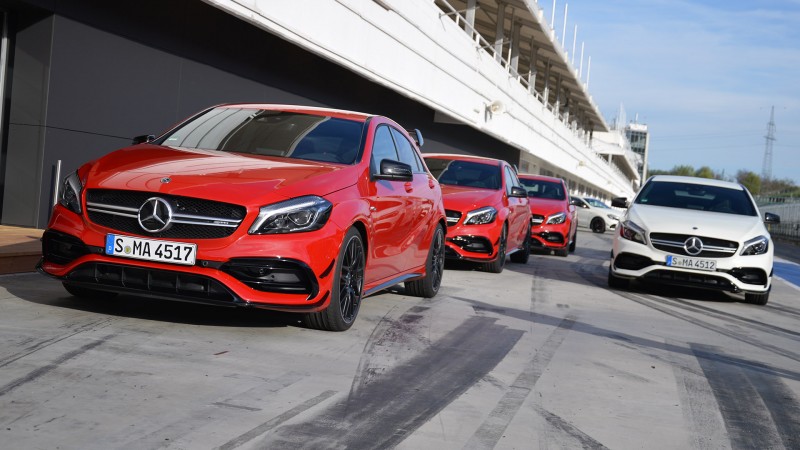 A kétszer három autóból álló konvojt két AMG GT S vezette fel a Hungaroringen, így egy másodpercig sem kellett attól tartanunk, hogy az instruktorok visszafognak majd minket – arról nem is beszélve, hogy a képzett pilóták egy jóval gyengébb autóban is képesek lennének súlyos szekundumokat ránk verni. A legkisebb Mercedes-AMG nem okozott csalódást, ugyanakkor a menetstabilizáló még Sport+ módban is rengetegszer vette el a gázt, de az összkerékhajtásnak köszönhetően a teljesen kikapcsolt Race üzemmódban is nehéz kihozni a sodrából a sportkompaktot – sőt, általában az orrát tolta kifele az A 45, a farát pedig csak komoly ráhatással lehetett táncba vinni. A fékek ugyan a nap végére már nagyon elfogytak, de így is megsüvegelendő, hogy 4-5 körönként egy néhány perces szünettel órákon át futottak a pályán az autók.