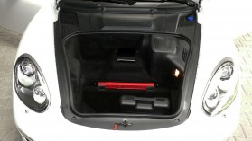 A praktikumért sem kell a szomszédba mennie a Boxsternek: a beltérben számos apró, nyitott illetve zárható rekesz várja a kacatokat, az ülések között pedig egy méretes polc is helyet kapott. És a csomagtartó? A középmotornak hála nem csak elöl, de hátul is kialakíthattak a tervezők egy poggyászteret, így összesen 280 liternyi űrbe (elöl 150, hátul 130) helyezhetjük el cókmókjainkat.
