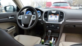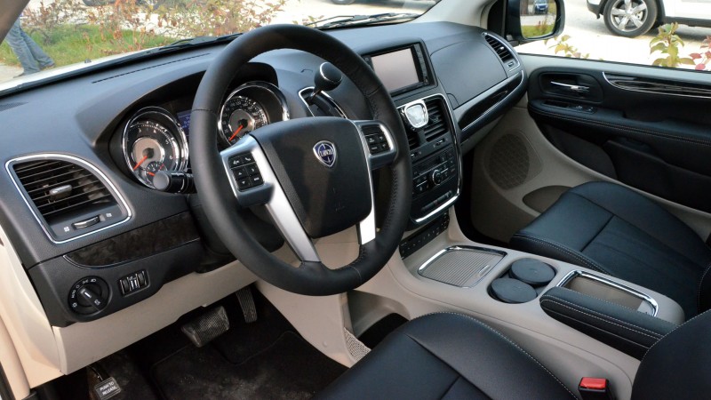 Az összhatás a középkonzolba integrált finom Lancia órával és a nagy, ám megszokást igénylő érintőképernyős rendszerrel együtt kétségtelenül prémium, igaz, az alsóbb részek műanyagjai már amerikaiasan kemények és ott már az összeszerelési minőség sem olyan szép.