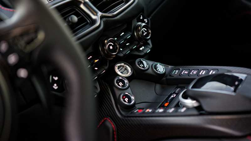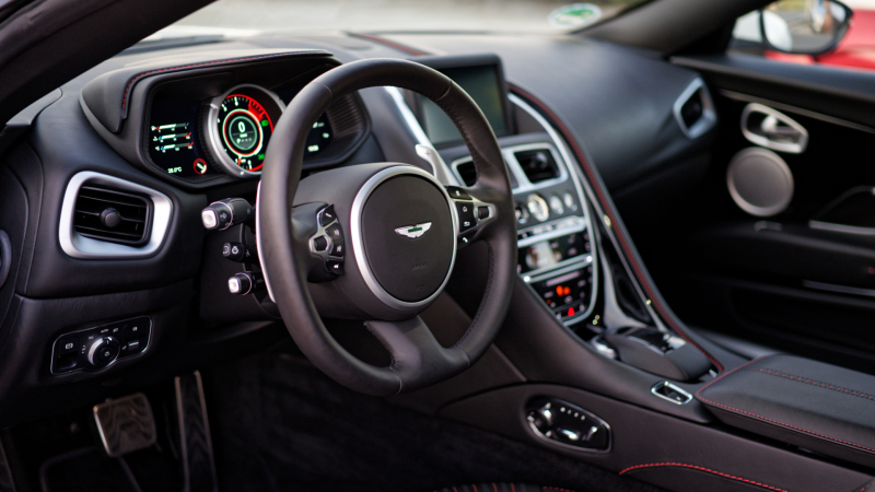 Megértjük azt, akinek a belső tér első ránézésre kicsit sok, főleg a Vantage esetében. Nehéz ugyanis a szokványostól radikálisan eltérőt alkotni, úgy, hogy közben a jól bevált kezelési koncepciót se rúgjuk fel. Ez a cél itt sikerült: a szép megmunkálású üveg és az ugyancsak jelentős számosságú műanyag kapcsolók tengere mögött a Mercedes-Benz-től érkező központi rendszer rejlik, amelynek kezelhetősége nem hagy kívánnivalót maga iránt. A digitális műszercsoport már egyedi alkotás: ez üzemmódtól függően változtatja a megjelenítést – főszerepben természetesen a fordulatszámmérővel. Ne vacakoljunk, keltsük hát életre!