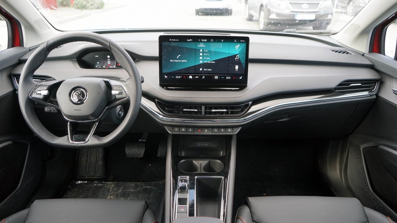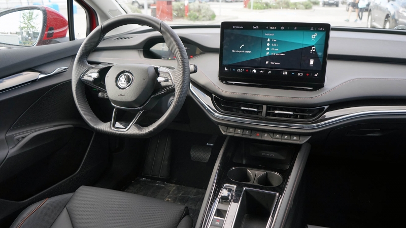 A vezető előtt közvetlenül egy kisebb, 5,3 colos, nem túlságosan informatív (a fogyasztási adatokat sem lehet rávarázsolni) és nem éppen személyre szabható digitális műszercsoport van, míg a központi kijelző 10 vagy 13 colos méretű lehet. Ez utóbbi az Octavia esetén megismert csúszkával és gombsorral is rendelkezik, és a rajta futó szoftver is a kompaktból lehet ismerős. Utóbbit sok kritika érte sok szempontból, és bár a kezelhetőség és a logika nem változott az Enyaqban, a rendszer stabilitására és sebességére a kipróbált modellben nem lehetett panasz – villámgyors és megbízható volt az egység.