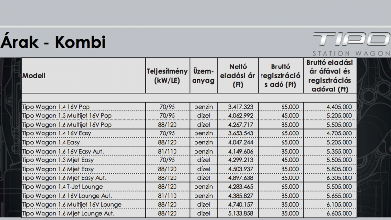 És hogy milyen a Tipo árazása? Szerencsére abszolút a földön járnak az árak, így a kombiként is tetszetős olasz modell az egyik legolcsóbb kompakt kombi a piacon. Ennek ellenére az ötajtós verzióhoz viszonyított 300 ezer forintos felára bizony nem kevés, azonban az igazsághoz hozzátartozik, hogy a kombihoz például minden esetben szériában járnak az elektromos hátsó ablakok, amely opcióért az ötajtósnál 50 ezer forintos felárat kell fizetni, így korrigálva mintegy 250 ezer forintot kóstál a praktikum és a nagyobb csomagtartó, valamint tágasabb hátsó fejtér.