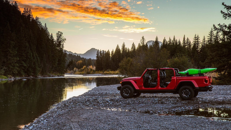 Szintén a legendás elődökre emlékeztető megoldás az előredönthető szélvédő. A Wranglerhez hasonlóan, a gyári bukókereten található a belső visszapillantó tükör, amely lehajtott szélvédő mellett is a helyén marad. Egyedüliként a platós terepjárók szegmensében a Gladiator rendelhető prémium Sunrider vászontetővel is. A tető kialakítása egyaránt lehetővé teszi a részben vagy teljesen nyitott autózást – vagyis tulajdonképpen egy kabriót is kapunk, szintén egyedülállóként a kategóriában. Követve a Jeep egyik legnépszerűbb hagyományát, a Gladiatornak ráadásul az ajtajai is könnyedén, néhány mozdulattal fel- és leszerelhetők, ami ugyan nem feltétlenül a biztonság záloga, de mondjuk terepen, lassú tempónál kétségtelenül sajátos ízt ad a mókázásnak.