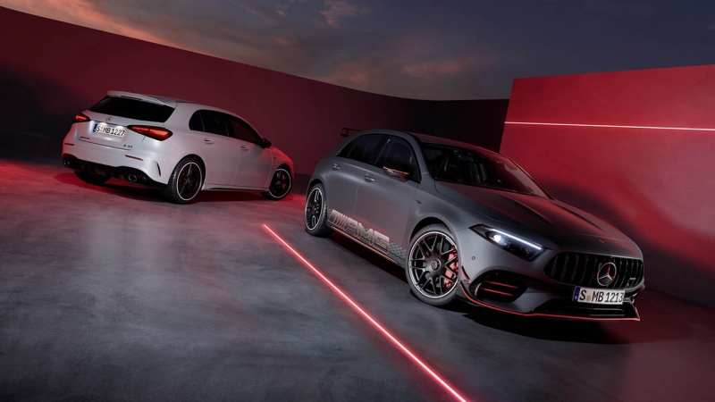 Frissültek az AMG kivitelek is, de csak annyiban, amennyiben a normál változatok is, így az agresszívabb lökhárítókkal ellátott modelleken talán kevésbé feltűnő a változás. Az A 35 ezentúl 48 V-os elektromos támogatást is kap, de ez nincs hatással a 306 lóerős összteljesítményre. Az A 45 S pedig kapott egy friss limitált kiadást Street Style Edition utónévvel, amely látványos mattszürke fényezéssel és rikító narancssárga díszítésekkel tűnik ki a tömegből – ha a 421 lóerő és az igen harcias kiállás nem lenne elég.