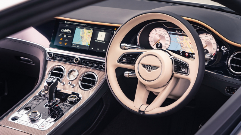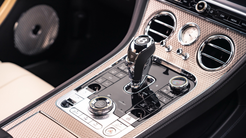 Gyémántmarásos technológiával munkálják meg a középkonzolt, a krómmal futtatott fafelület alapanyaga pedig nem más, mint egy Grand Black nevű diófa. A középkonzol közepére egyedi Breitling óra kerül, és érdemes megfigyelni a szálcsiszolt hátlapját, hiszen a mintázat szépen (és miniatürizált formában) rímel a műszerfal borítására. A belső személyre szabhatóságát jól szemlélteti a 88 különböző színű és erezetű faborítás; a megfelelő lehetőség teljes harmóniát teremthet meg akár a jármű külsejével, akár a beltérrel.