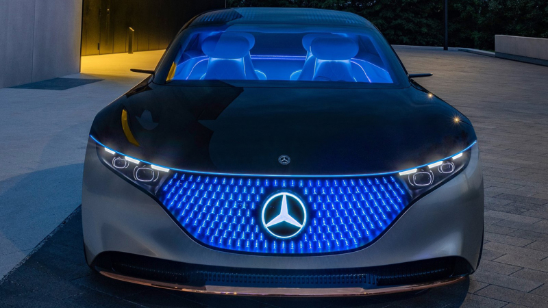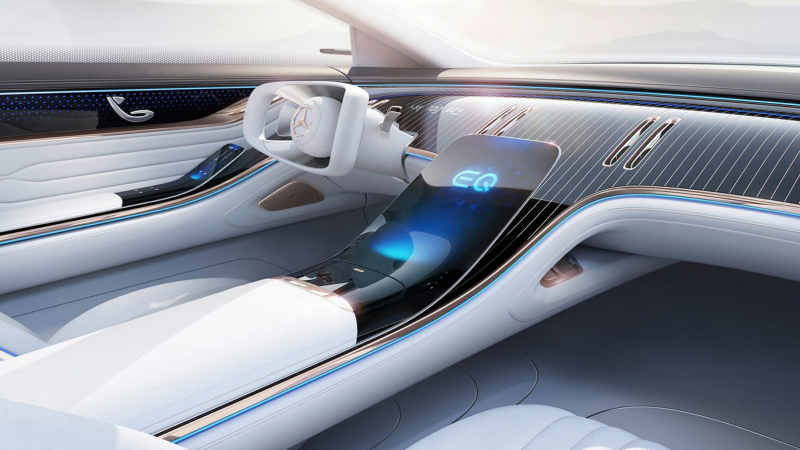 Belül az alapformákat tekintve olyat láthatunk, amilyenhez hasonlót már az új, jövőre érkező S-osztály generáció kémfotói megmutattak: a felfelé ívelő középkonzolon egy hatalmas képernyő jut főszerephez, amelyet végletekig letisztult részletek és különböző kiegészítő képernyők öveznek. A finom (mű)bőrkárpitozáshoz az üveg társul igazán prémium vonásként, a fenntarthatóság pedig egyre fontosabb szemponttá válik. Így például PET palackok, óceáni hulladékok és felesleges műszálas anyagok nyernek új értelmet beül.
