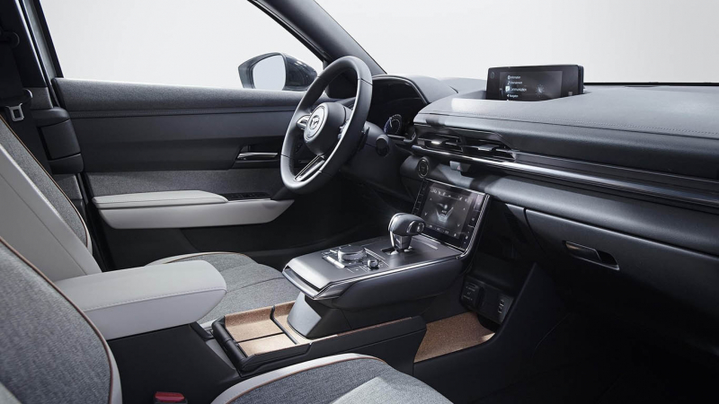 A belső térben olyan környezetbarát anyagokat találunk, melyek vegán alternatívával helyettesítik az igazi bőrt a legtöbb felület esetében. A látványos, lebegő középkonzolt környezetbarát gazdálkodásból származó parafával borították, és vannak igen kreatívan használható pakolóhelyek is. Az utastér is azért magán hordozza a Mazda néhány jellegzetességét, de az érintőképernyős klímapanel például újdonság. A multimédiás rendszer természetesen a japánok legfrissebb szoftverét futtatja, amely ismer minden mobilos csatlakozási lehetőséget. Pontos adatok egyelőre még nem állnak rendelkezésre, de nagyjából a 3-assal azonos méretekre számíthatunk.