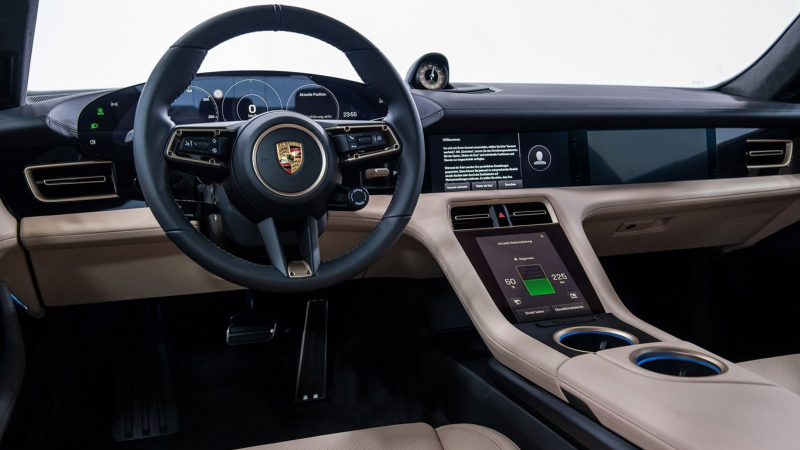 Ez persze csak kis kompromisszum, cserébe viszont négyen élvezhetik a Porsche egyik leggyorsabb és kétségtelenül leginnovatívabb modelljét. Márpedig élvezet lesz itt bőven, amit nem csak a potens elektromos hajtás, de a fejlett belső tér is elősegít, amely anélkül mutat fel (opcionálisan) öt kijelzőt, hogy digitális visszapillantó tükrökről beszélnénk. A központi 10,9 colos egység mellett van egy gyönyörű, különálló digitális műszercsoport is, de felárért az utas is megkapja a saját panel mögé bújtatott érintőképernyőjét, sőt, a márkára jellemző módon emelkedő műszerpulton is találunk egy haptikus visszajelzésű padot, ami a bevitelt könnyíti meg.