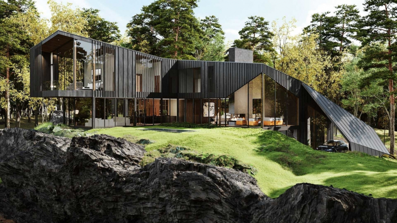 A szabadság érzetét a padlótól mennyezetig érő üvegfelületek fokozzák, az épület eleganciáját pedig a fekete cédrus homlokzat alapozza meg. Az 555 négyzetméteres főépület mellett egy fedhető medence, egy mókás faház, illetve három kisebb vendéglak is helyet kapott a telken.
