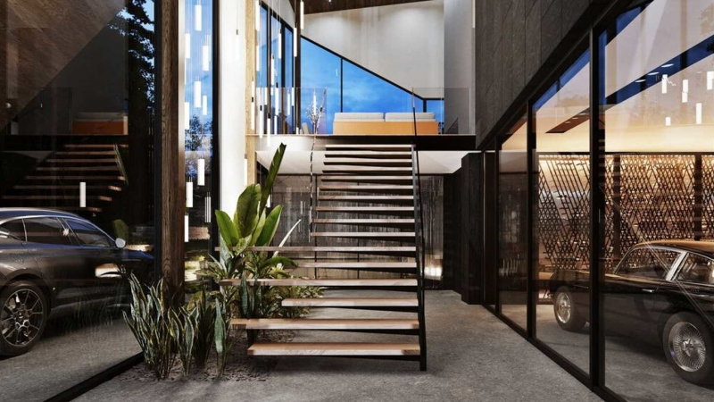 A nappalival üveges összeköttetésben álló háromállásos garázs mellett bő 600 méter hosszú aszfaltozott rész várja a vendégek autóit. Stílusosan Aston Martinnal érdemes érkezni, hiszen a házban található összes fa, fém és bőr felület a brit tervezők keze nyomát viseli. A végeredmény meglehetősen lélegzetelállító. Nem mellesleg akár egy DBX SUV is elfér a borospincében.