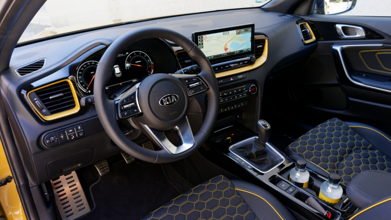 Az utasterében az XCeed a Ceed-nél már bevált kialakítást kapta meg, de két tekintetben változás történt. A legnagyobb érdekesség a 150 ezer forintos új, sárga belső színcsomag: ez esetben fekete a kárpit, kontrasztos hatású sárga varrással az üléseken és az ajtóburkolatokon, némi sárga betéttel a műszerfalon. A külső sárga színnel kombinálva van tehát egy slágergyanús merész kompozíció, de természetesen hagyományosabb kivitelek is akadnak (alapból is különlegesebb fekete szövet jár, felárért pedig fekete-szürke vagy fekete bőrkárpit is akad). Az ülések csípőpont-magassága különben 42 mm-rel magasabb az alap Ceedénél (ez gyakorlatilag a hasmagasság-növekménynek felel meg), így a be- és kiszállás is könnyebb és kényelmesebb, miközben továbbra sem azt érezzük, hogy bent az autón ülünk, egy kakasülőről körültekintve, hanem beleolvadunk a műszerfalba.