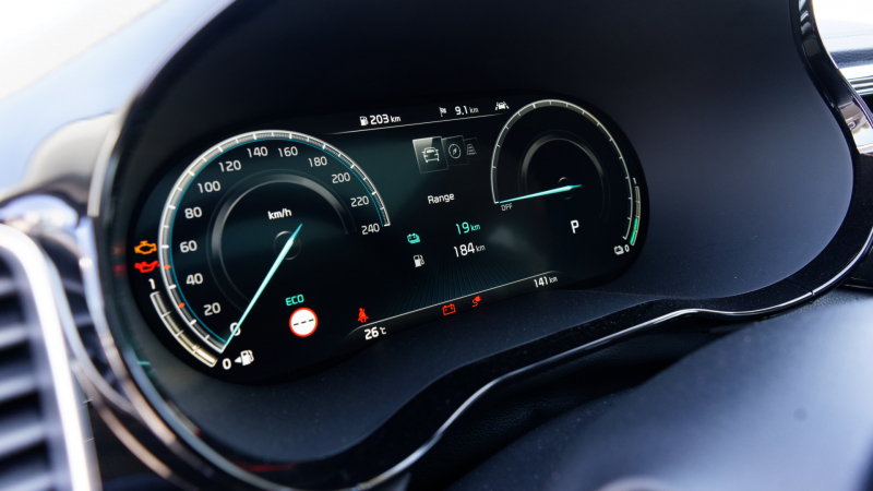 A szintén új, ultraszéles 10,25 colos érintőképernyővel dolgozó multimédiás rendszer (ami kezelési logikáját és látványát tekintve megegyezik a Ceed központi egységével) persze okostelefon-tükrözésre is képes. Ez 300 ezres felárral rendelkezik a már jól ismert 8 colos egységhez képest (vagy bizonyos csomagokban széria), tudásban pedig hasonlót nyújt, szebb formába csomagolva. A két legjobb felszereltségi szinttől elérhető, 12,3 col képátlójú, Supervision fantázianevű digitális műszercsoport is újdonság a Kiánál – és számunka egy kicsit csalódást kelt. Kétségtelenül látványos ugyan, de a márkánál egyelőre nem éltek a képernyő jelentette rugalmassággal, vagyis teljesen ugyanazt és jóformán ugyanúgy olvashatjuk itt le, mint ha a hagyományos, analóg órákat néznénk egy kiegészítő digitális kijelzővel. Emellett pedig a képfrissítés kicsit lassú, amit a fordulatszámmérőn láthatunk vagy akkor, ha a csúcsmodellben átkapcsolunk sport módba (ez lényegében egy kicsit dinamikusabb tipográfiát és a sebesség/fordulatszám digitális megjelenítését is tartalmazza). Szóval érdemleges előny nincs, hátrány pedig van, plusz pénzt így mi nem hagynánk ott a megoldásért – hozzátéve, hogy innen szoftveres frissítéssel lehet fejlődni, így elképzelhető, hogy a Kia utólag megoldja, hogy például a navigáció térképét teljes egészében magunk elé tegyük.