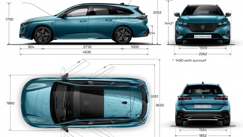 Elődjénél 6 centivel hosszabb és kettővel alacsonyabb az új 308 SW. A nyomtáv elöl-hátul változatlan, az A-oszlopot viszont hátrébb húzták, az így kapott hosszabb motorháztetővel megváltozott az autó kiállása is. Az SW túlnyúlása egyébként 21 centivel múlja felül az ötajtósét.