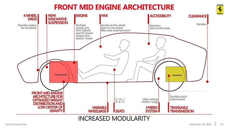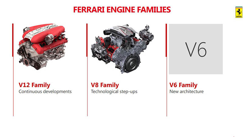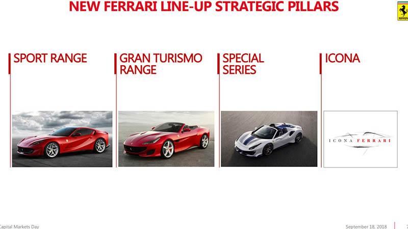 Az új alapok egyébként orrmotoros felépítést biztosítanak majd, ám a duplakuplungos automata váltó a hátsó tengelyhez kerül, ezzel elérve a kiváló súlyeloszlást. Ennek kapcsán egyébként jövőbeli terveit is megosztotta a Ferrari, melyek szerint minden eddiginél több újdonsággal készülnek. 2022-ig 15 újdonsággal készülnek a gyáriak, melyeknek jó része hibrid hajtást kap majd, így addigra a modelljeik 60 %-ában lesz elektromotor is. A kínálatot egyébként négy részre fogják felosztani: a Sport szériába a teljesítményorientált típusok kerülnek, mint a 488 GTB vagy az F12 utódai, a Gran Turismo szériába a komfortra, utazásra kihegyezett típusok, mint a GTC4 Lusso, a Portofino vagy a Purosangue. Ez a két széria adja majd a modellek nagyrészét, de mellettük ott lesznek a speciális, limitált modellek, mint a 488 Pista, illetve az Icona sorozat is, amelynek első két tagja éppen ma mutatkozott be.