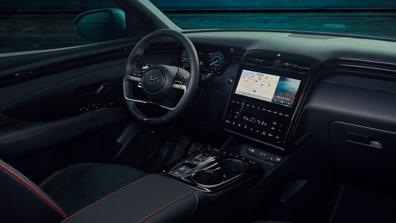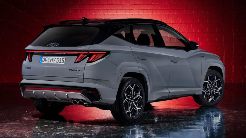 A Tucson N Line mélyebbre nyúló és szélesebb lökhárítókkal, azaz nagyobb légbeömlőkkel fokozza a modell dinamikáját, de az új hűtőmaszk is látványosabban hivatott törni a fényt. A fényszórók fekete keretet és N Line feliratot kapnak, de a sötét szín máshol is feltűnik, így például a külső tükrök borításán. A szériában 19 colos kerekek a hűtőrács mintázatát idézik meg. A hátsó légterelő hosszabban nyújtózik, az új lökhárító pedig diffúzorbetéttel házasodott.