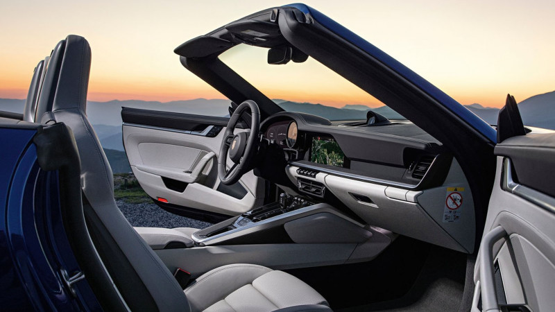 A formák tekintetében kétségtelenül a beltér hozta a legnagyobb megújulást, a 911 enteriőrjét ugyanis teljes egészében áttervezték. A legszembetűnőbb az új középkonzol mellett talán az új műszercsoport, ami ívelt kialakításával az 1970-es évek 911 modelljeit juttatja eszünkbe. A klasszikus ‘öt körműszeres’ kialakítás persze megmaradt, de már csak a középen trónoló méretes fordulatszámmérő maradt analóg: tőle balra és jobbra egy-egy hétcolos képernyőn csodálhatjuk meg a kisebb, természetesen változtatható témájű műszereket. A középkonzolon a 10,9 colos érintőképernyő kap főszerepet, amiről az új PCM rendszert vezérelhetjük – a navigációs és a multimédiás beállításokon felül innen változtathatunk számos beállítást is.