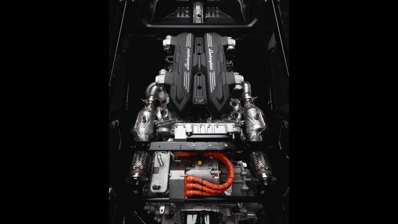 Az olaszok váltóból is újat fejlesztettek, méghozzá egy nyolcfokozatú duplakuplungos egység képében, amelyben egy elektromotor is helyet kapott, és még így is „csak” 193 kilogrammot nyom – ezzel könnyebb, mint a Huracán váltója, amiben nincs elektromotor sem. Amellett, hogy indítómotorként funkcionál, a hajtásba is be tud szállni ez az egység, ám a valódi pluszt nem ez, hanem az első tengelyt hajtó két társa adja, amelyeknek köszönhetően az összteljesítmény 1000 lóerő felett lesz. Az energiát pedig egy 3,8 kWh-s akku biztosítja majd, amelyet középen helyeztek el a mérnökök – köszönhetően annak, hogy a váltó hátra került.