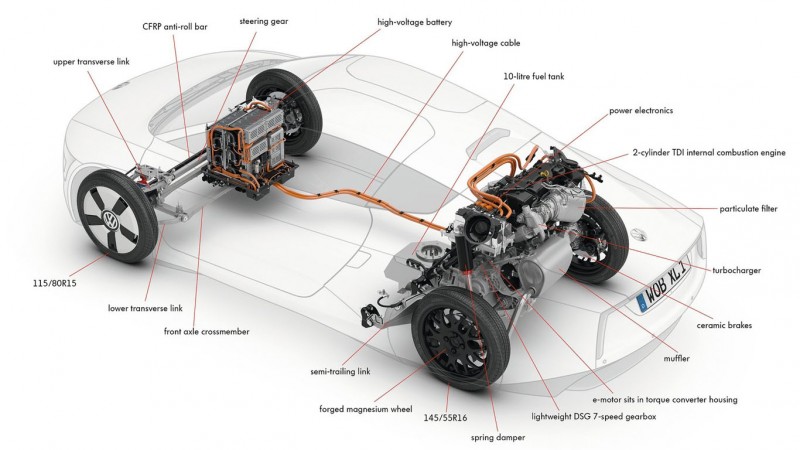 A szupertakarékos működés miatt teljesen kizárt volt a benzinmotoros segítség, így csakis dízelmotor jöhetett szóba. A 0,8 literes, soros, kéthengeres egységet a VW mérnökei a gyártó négyhengeres 1,6 literes dízeléből fejlesztették ki – a végeredmény 48 lóerő és 120 Nm. Mindkét motort használva az XL1 rendszerteljesítménye összesen 68 lóerő, ami 12,7 szekundumos 0-100 km/h-s sprintidőt tesz lehetővé.