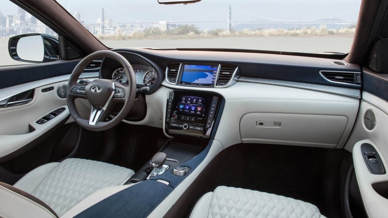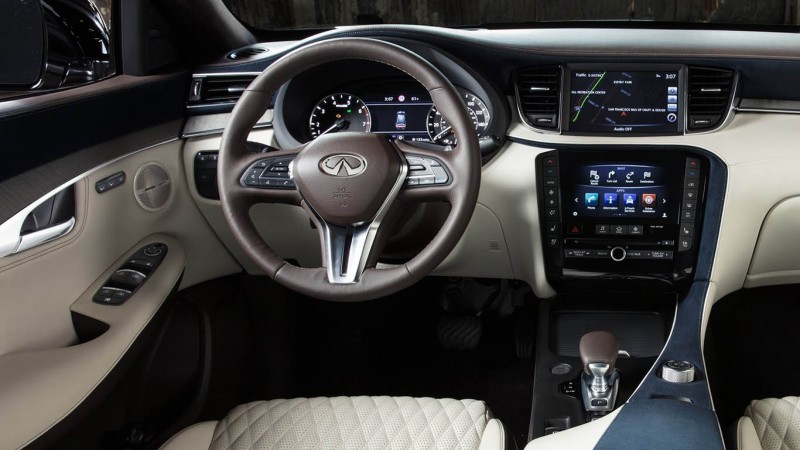 Ha már az utastérnél tartunk: az alapformákat a Q50-től örökölte az újdonság, a középkonzolon két érintőképernyő biztosítja, hogy minden funkciót elérjünk – de a klíma például külön gombokat is kapott. Az Infinitit ismerve az anyagminőséggel és a kivitelezéssel biztosan nem lesz gond, a formák pedig akárcsak kívül, belül is egyediek és az egész enteriőrből sugárzik a prémiumérzet, amit a magas felszereltség tetéz, hiszen a legtöbb prémium konkurenssel ellentétben az Infinitiből nem lesz olyan fapados belépőmodell, amelynél az ember hátsójába kis túlzással beleáll a szálka. A felszereltség függvényében szinte minden bőrrel és/vagy Alcantarával van bevonva, ráadásul a különböző felületek közötti váltást is látványosan sikerült megoldaniuk a tervezőknek. Modern extrákból nem lesz hiány; a QX50 megkapta az új Nissan Leaf-ben bemutatott ProPilot önvezető rendszert, ami beavatakozás nélkül is képes vezetni – de csak autópályán, sávváltás nélkül.