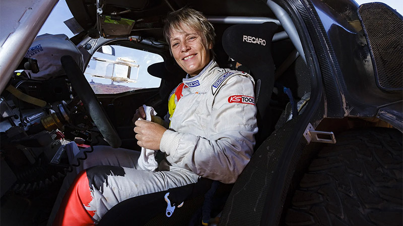 Macskák vontatta hintón száguldott Freyja, a germán istennő, akihez hasonlítani tudnám a listámon másodikként szereplő Jutta Kleinschmidtet. A közel hatvan esztendős német versenyző versenyautóit ugyan macskák helyett többszáz tüzes ló(erő) hajtotta, de varázsolni Ő is jól tudott. Három alkalommal motorral, és tizenkét alkalommal pedig autóval vágott neki az akkor még tradicionális vonalvezetésű Párizs-Dakar ralinak és 2001-ben meg is nyerte azt. Ironikus módon a toronymagasan esélyes japán Hiroshi Masuoka és hősünk volt férje, a Dakar menő és autóépítő francia Jean-Louis Schlesser volt az, akiktől 2 perc és 23 perc előnnyel elvette a győzelmet. A győzelmen kívül még szerzett egy ezüst és két bronzérmet az évek alatt a Szahara homokjában. Sporttörténeti érdekesség továbbá, hogy 2003 és 2006 között az az olasz versenyzőnő Fabrizia Pons volt a navigátora, aki már a fentebb említett Michéle Mouton mellett is mitfahrerként olvasta az itinert a 80-as évek első felében.