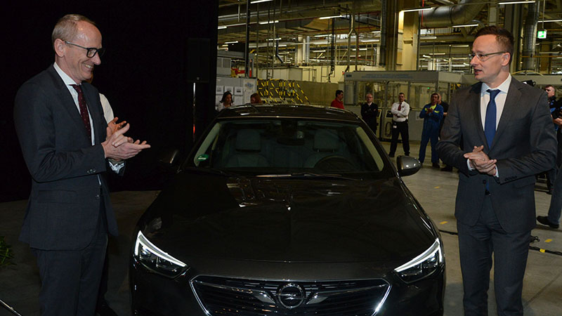 A díszvendégek: Karl-Thomas Neumann és Szijjártó Péter, mögöttük pedig az új Opel Insignia