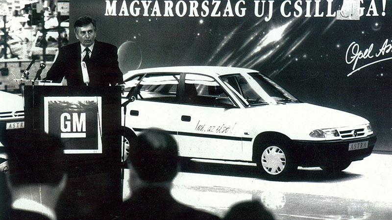 Neumann felidézte az első magyar Astra születésnapját, és idézte Antall József miniszterelnököt, aki annak idején arról beszélt, hogy az Opel új ipari kultúrát teremtett Magyarországon, az első magyar személyautót pedig a politikai változások gazdasági szimbólumának nevezte.