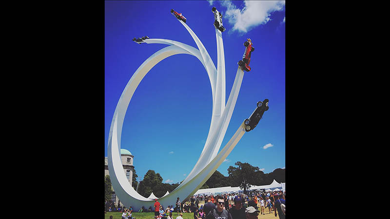 A Goodwood FOS egyik nagy látványossága egyébként a birtokon található hatalmas kastély előtt elhelyezett monumentális szobor, amit 1997 óta minden évben egy másik márka tiszteletére készül el, és szinte kivétel nélkül helyet kap rajta egy, vagy akár több négykerekű is. 2017-ben fordult elő először, hogy nem egy márkát, illetve annak valamilyen sikerét hirdette a hatalmas mű, hanem Bernie Ecclestone életműve előtt tisztelgett – idén egyébként a Porsche kapott egy hatalmas szobrot. Ezeket a mesterműveket minden esetben a híres angol művész, Gerry Judah tervezi meg.