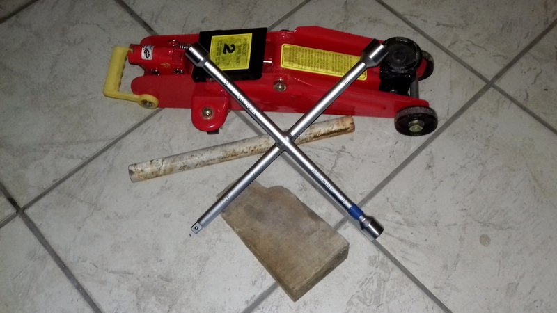 Maga művelet pofon egyszerű, nem kell hozzá más csak egy kerékkulcs, egy emelő, és ha precízek akarunk lenni, egy ék. A gyári emelő csak szükségmegoldás, egy „krokodil” viszont megtérül két csere alatt. Illetve, aki nem akar mindenféle légtornász mutatvánnyal az autó oldalát fogva taposni a kerékkulcson, hogy meginduljon az anya, vagy csavar, na, annak jól jön egy kis erőkar hosszabbítás. Nálam ez egy békebeli, rozsdával szelíden antikolt fémcső.