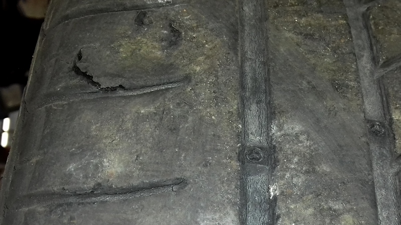 A baloldalon jól látszik, hogy a gumi futófelületéből cafatok szakadtak ki