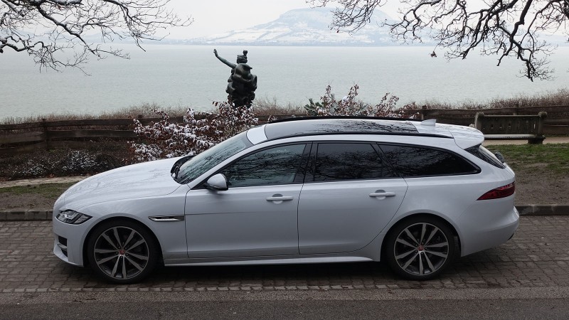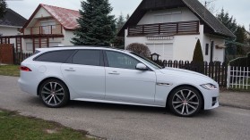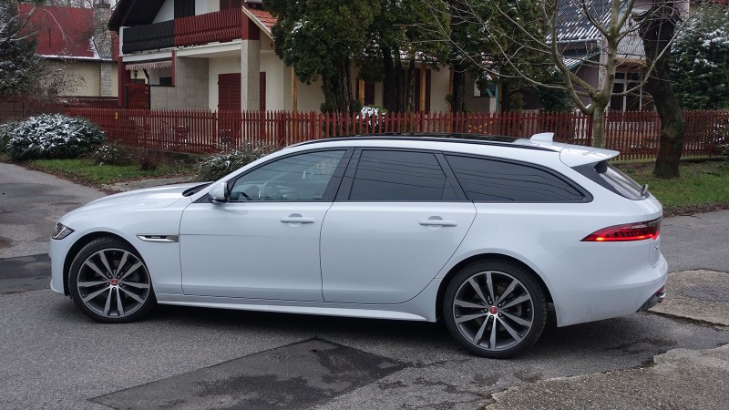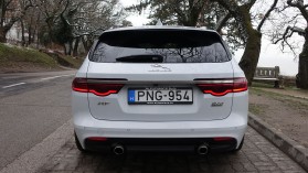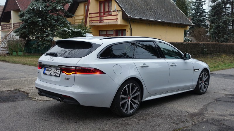 A belső tér meglehetősen konzervatívA modell elkészítése során hagyományos receptúrát követtek a britek: a hátsó ajtótól számítva mindent lecseréltek, és szép nagy puttonyt alkottak a kombinak. Az új hátsó lámpák LED-es világítása az F-Type-ra emlékeztet, és más tekintetben is hangsúlyozzák a fejlesztők, hogy a dinamika nem változott, csak a praktikum javult, amit tapasztalataink alapján szintén meg tudunk erősíteni. Ha már praktikum: az elektromos csomagtérnyitás itt is széria, szükség esetén pedig elektromosan lenyitható vonóhorog is rendelkezésre áll. A hátsó szintkiegyenlítős légrugózás ugyancsak alapfelszereltség a kombi esetén, így nehezebb pakkokkal is vízszintesen áll a modell – mindezt opcionálisan adaptív lengéscsillapítással is kiegészíthetjük az első tengelyen. A magas kombifelárat tehát többek között ezek a tételek ellensúlyozzák.