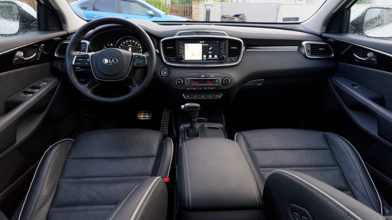 Így a vadonatúj Santa Fe mellett egyszerűnek, már-már unalmasnak tűnik a Sorento műszerfala, ezen a tényen pedig GT Line felszereltségű tesztautónk fekete bőrkárpitja sem változtat – a barna opcióval azért lehet egy csavart adni. A klímakonzol egészen múltidézőnek hat, de gyorsan hozzátennénk, hogy minden működik, a modernebb megoldások pedig a kezelhetőségen semmit sem javítanak, maximum a látványhoz tesznek hozzá. Egyébként teljesen funkcionális, azaz könnyen kezelhető a belső, jó összeszerelési minőséggel. Az ízléses krómhatású műanyag betétek, valamint a sötét, rácsos díszítőelemek szépek, a műszerfal tetején látható mímelt bőrvarrás pedig azért ad egy kis hangulati pluszt. A tavaly érkezett modellfrissítés pedig a kormánykerékre is hozott belőle.