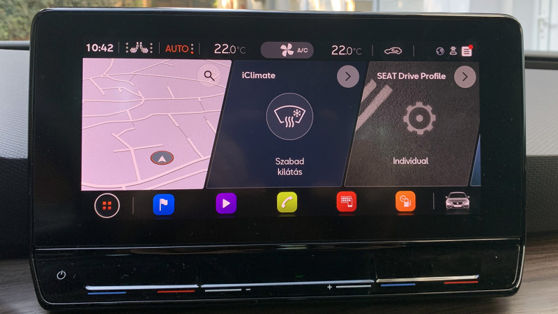 Kapcsolók hiányában kénytelenek vagyunk a nem mindig logikus felépítésű, de minimum kevéssé intuitív (az ablaktörlők vezérlése pl. a ’Visszapillantók’ menüpontból, a menetadatok nullázása a negyedik mélységig leásva lehetséges) menürendszerből vezérelni a vezérelni valókat. Személy szerint komoly visszalépésnek éltem meg a szisztémát a kifutó generáció alapvetően jól működő megoldásához képest. Az előző gondolat margójára, egyebek mellett az ülésfűtés és a teljes szellőzés a központi kijelzőről irányítható, minden más funkcióhoz hasonlóan. Soha nem volt még aktuálisabb Biczó Laci kollégám cikke az eltűnt gombok miértje után kutatva – érdemes elolvasni, ha még nem tették. Tulajdonképpen örülhetünk, hogy az ablakemelőket (még?) fizikai kapcsolókkal működtethetjük...