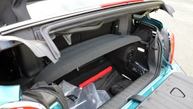 A helykínálat elöl szintén a helyén van, és a hátsó két hely még zárt tetővel is jól használható a kategóriához képest – persze ilyenkor az elsőknek sem árt kicsit összehúzni magukat. A praktikumra nem lehet panasz: tárolórekeszeket több helyen is találhatunk, és bár a nyitott tetővel 165, zárttal pedig 210 literes csomagtér elsőre nem tűnik túl méretesnek, a kabriósok tudják, hogy egyáltalán nem számít ez szörnyűnek. A MINI mérnökei ráadásul ledönthető hátsó üléstámlákkal is megajándékoztak minket, és a vászontetőt is fel tudjuk billenteni, hogy a nagyobb csomagokat is könnyebben tudjuk elhelyezni – ez pedig úgy lehetséges, hogy a csomagtérajtó egyébként lefelé nyílik.