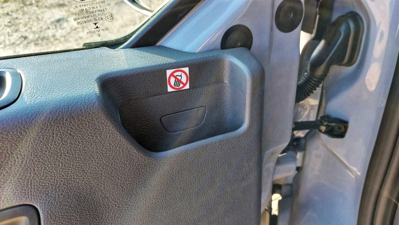 Indulunk is útnak! Felpattanok a vezetőülésbe, a kabátot felakasztom az erre szolgáló akasztóra, a menetlevelet lefogatom a helyén. Reggeli frissítőt a pohártartóba, rágót és minden csetreszt a rengeteg zseb és polc valamelyikére helyezem. Mindennek van helye, ez szuper! Csak arra vigyázzunk, hogy a mobilunkat ne helyezzük a „telefontilóba”. Akármennyire is mobiltartónak tűnik ez a képen látható kis odú az ajtóban, a figyelmeztető piktogram nem hazudik: úgy kettétöri a telefont a csapódó ajtó mint a ropit.