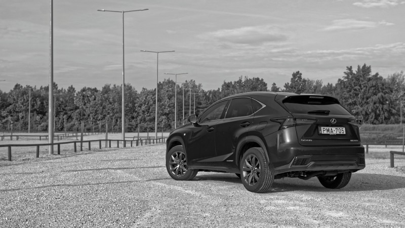 Sportabroncs vagy puha futómű kelleneUgyanis nem csak formailag merész a közepes Lexus SUV, de vezetni is élmény. Mindezt már a pontos, tökéletesen súlyozott, közvetlen kormányzás is szavatolja. Ehhez társul a sport üzemmódban egészen dinamikusan viselkedő adaptív futómű, amely ebben az állásban nem billeg, hanem kiszámíthatóan és biztonságosan fordul, sőt, kanyartempó tekintetében szerintünk részben feledtetné a mérve üresen 1,87 tonnás tömegét – megfelelő abroncsválasztással. Ahogy azonban korábbi turbómotoros tesztautónknál, úgy most is mellé lőtt a Lexus: ezúttal csökkentett gördülési ellenállású helyett többcélú, terepes jellegű abroncsokat kaptunk a Bridgestone Duelerek képében, amelyek szinte úgy kenődtek a forró aszfalton, mintha téli abroncsok lennének. Ha valaki komolyan gondolja az F Sport csomagot és az élvezetes vezetést magas felépítéssel is, annak minimum egy abroncsváltással kell kezdenie.