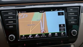 Megkérik a 'nagy' navi árát, de jó is a rendszerEzek után nem meglepő, hogy tároló helyből is bőven akad, így összes kacatunknak garantáltan helyet fogunk találni. Amint már fentebb is említettük, a helykínálatra kár szót fecsérelni, legyen elég annyi, hogy a Superb ilyen tekintetben etalon, és külön öröm, hogy a szedánforma ellenére a hátsó fejtér is jó akár 190 cm-es testmagasságig. Az elődnél a belső szélesség viszonylag korlátozott volt, azonban az aktuális generációnál ez is megoldódott. Szerencsére nem csak a tér nagy, de az ülések is elöl-hátul kényelmesek, az ergonómia pedig példás, egyedül egy fizikai műszerfali fényerő-szabályozó kapcsolónak örültünk volna, mert így minden változtatáshoz el kell mélyülnünk a központi rendszer kissé bonyolult és túlburjánzó menüjében. Még az a szerencse, hogy az érintőképernyős rendszer tud magyarul, legyen szó akár az egyszerűbb, kisebb képernyős változatról, akár a mostani tesztautóban szolgáló ’Columbus’ nevű csúcs multimédiáról, amihez ezúttal szépen szóló Canton hifi is tartozott.