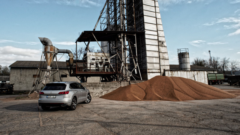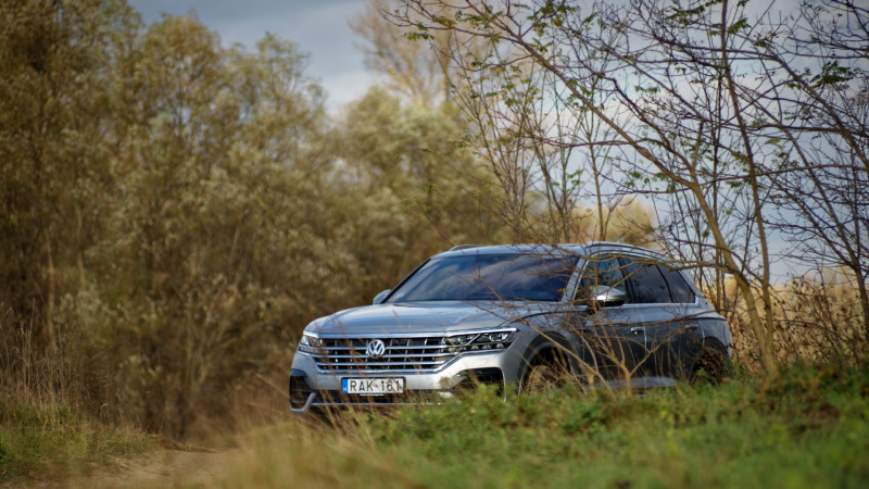 Ez még közelebb állt volna a gyári 6,1-es adathoz, ha az illetékesek eltekintenek a 285 mm széles, 21 colos kerekek megrendelésétől, azonban úgy tűnhetett, hogy a sportos R Line-hoz érdemes bejelölni a drága opciót. Nos, a menetdinamika a SUV kategóriában szinte mellékes, egyébként pedig nem ajánlanánk a hatalmas malomkerekeket, de ezúttal nem tudjuk azt mondani, hogy a rugózást elrontotta a tengelyek végén lógó hatalmas tömeg. Ugyanis az opcionális dőlésszabályozással rendelkező légrugózás parádésan dolgozott velük. Az összes úthibát olyan szépen rugózta ki, hogy valószínűleg a széria 18-as ballonos kerekeken a világ egyik legkényelmesebb autója, és a legkényelmesebb SUV modellje lenne az új Touareg. Eközben pedig ne feledjük, hogy igény esetén csökkenteni és emelni is lehet a modell magasságát – utóbbi pedig terepen az üzemmódválasztóval együtt jó szolgálatot tud tenni az akár 580 mm-es merülési mélység mellett.