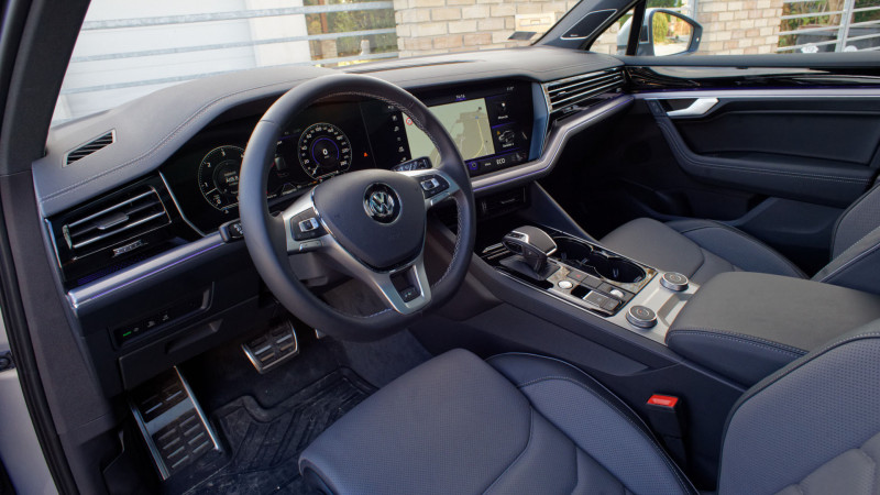 Az anyagminőség természetesen kiváló, az összeszerelés pedig teljesen rendben volt, a kidolgozás azonban kicsit elnagyoltnak tűnhet a prémium konkurensekhez képest. Ez persze a korábbi generációk sajátja is volt, de ez nem jelenti azt, hogy ne nyújtana sokat a Touareg. Sőt, ezáltal mindig átláthatóbb is volt a kezelése, és ez most sincs másként alaphelyzetben, de a középkonzoli gombokat bő egymilliós felárért egy hatalmas kijelzőre cserélhetjük.
