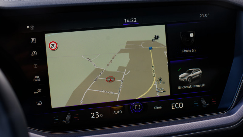 A feláras központi rendszer pedig így akkora, hogy attól valóban mindenkinek leesett az álla. A megjelenítés szép, éles és kellően kontrasztos, a kezelés jól működik, a menürendszer jól csoportosított. A 12 colos műszercsoport kellő mértékben személyre szabható, és egyáltalán nem öncélú. Csakhogy ezt megkapjuk alapból is a széria navigációval együtt, a nagyobb kijelző pedig szerintünk felesleges. Feleslegesen nagy. A 15 colos kijelzőn már nem tudunk kézmozdulatokkal mindent beállítani, van, amikor a személyre szabáshoz karmozdulatok kellenek, hogy minden elérjünk. Emellett a 8 colos alapkijelzőre optimalizált (széria) Apple CarPlay/Android Auto is viccesen a monitor közepén jelenik meg, márpedig valószínűleg úgyis mindenki a telefonos tükrözést fogja használni. Az új rendszer persze így is jó, csak nem éri meg bő milliós felárát.
