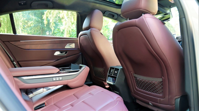 A masszírozó, szellőztethető, AGR minősítésű ülés fantasztikus élményt nyújt, ingben, öltönynadrágban sem izzadt meg a hátam. 32 fokos melegben ilyen kisimultan kiszállni egy autóból hosszú út után elég ritka élmény; azt hiszem ez is a luxusnak egy megnyilvánulása. Mint az a varázslat is, ahogy ez az autó az üvegtető ellenére egy csapásra lehűl. Pillanatok alatt biztosítja a kedvező hőmérsékletet és a több mint 900 km alatt egyszer sem éreztem, hogy nem találtam el a beállításokat vagy az intenzitást. Ugyanez a hátul ülők kényelmére is igaz, ott is található üléstemperálási lehetőség, masszázs funkció, kétzónás klíma és szép nagy lábtér is, amely jobb hátul gombnyomásra növelhető az előtte lévő ülés mozgatásával. Megjegyzem ez kisgyermekes apukáknak is nagy segítség a gyermekülés és a gyerkőc behelyezésekor rendelkezésre álló harctér tánctér…