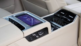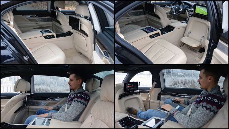 A pihentető utazás már csak a fűthető és szellőztethető masszázsüléseknek köszönhetően is garantált, de az 1,88 millió forintos Bowers & Wilkins Diamond hangrendszeren keresztül néhány kellemes dallammal még kellemesebbé varázsolhatjuk az utat. Ha ez sem győzne meg minket, az első ülések támláján megtalálható méretes képernyőkön keresztül tévét is nézhetünk – ezeket egyébként csak egy távirányító segítségével tudjuk kezelni, viszont az iDrive szinte összes funkcióját megkapjuk vele, és a multimédiás rendszer vagy a navigáció esetében felül is írhatjuk a sofőr parancsait. A játékszereknek itt még nincs vége, hiszen az előző két tesztautóban is megtalálható Samsung tablet is helyet kapott a könyöklőben, ami ezúttal is minden fontos funkció irányítására képes, noha mindenre találunk külön kezelőszerveket is – így például az üléseket vagy a napfényrolókat is többféleképpen állíthatjuk. Ha mégis saját eszközeinkkel szeretnénk foglalkozni, egy kis asztalkát is elővarázsolhatunk.