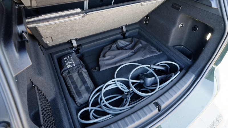 A töltőkábeleknek a csomagtér padlója alatt van hely. A töltő kevésbé informatív és jóval nehezebb, mint a korábbiak
