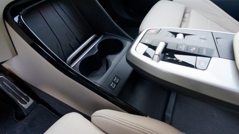 A BMW-től megszokott, művészin megformált váltó-előválasztótól is búcsút vehetünk, ugyanis az újdonságban már csak egy kis billenőkapcsolóval választhatunk az üzemmódok között – igaz, a lebegő hatású középső konzolon ez is elég jól mutat. Emellett nagyon sok tárolóhelyet kapunk, praktikus telefontárolóval. Az anyagminőség emellett kiváló: a természetes érzetű fabetét különösen kellemes, a harman/kardon audiorendszer hangszórói egyedi, fém borítást kapnak, a műszerfalat is bőrbe boríthatjuk és az összeszerelés is rendben van.