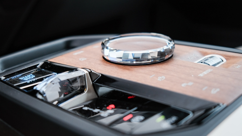 Kristály elemekből még három helyre jutott: a fedélzeti rendszer tekerős kontrollere és a hangerőszabályzó henger is abból van, valamint a hajtáslánc előválasztó-kapcsolója ugyancsak díszesre faragott kristály. Utóbbiak ráadásul haptikus érintőgombokat is tartalmazó pőre fa dekorelemre kerültek. Egy kis egyedi, stílusos, de tényleg nem túltolt megoldáshalmaz mindez.