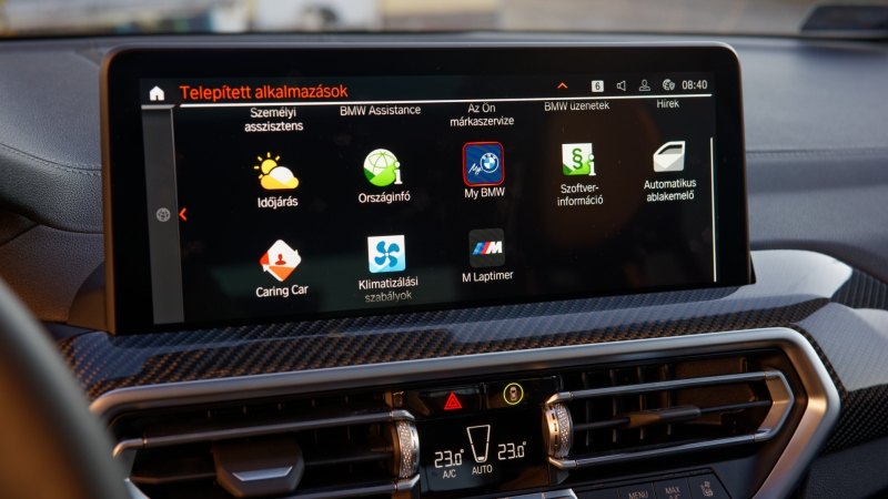 A BMW 4-esben bemutatott középkonzol költözött be az X3/X4 utasterébe. A kisebbik érintőképernyő 10,25 colos, a nagyobbik egység 12,3-as. Természetesen utóbbit tesztelhettük a tesztautóban is. A korábbinál kissé karcsúbb csoportosítású menüt a több funkcióval egy kicsit szokni kell az elődből átülve, ugyanakkor számos hasznos rövidítés segítheti a dolgunkat. Például a 360 fokos kamera aktiváló gombja ugyan ergonómiai szempontból nincs jó helyen az előválasztó kar mellett, de elmenthetjük a rendszerben, hogy hol aktiválja magától a funkciót, így a megszokott parkolókba érve nem kell vesződnünk a lefelé pillantgatással.