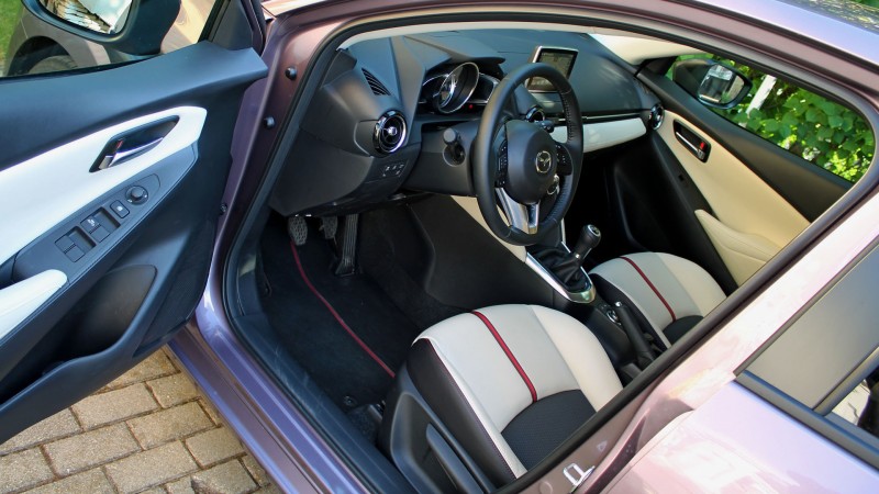 Igazi feladvány Mazda tesztautónk ebben a konfigurációban. Kívül lilametál színű, belül fekete-fehér a kárpitja, melyet piros díszítő csíkokkal dobtak fel, valójában mégsem ettől színes a karaktere. Játsszunk csak el a gondolattal, ha letakarnám a képeket és csak kérdezgetnének a kocsiról, vajon hány modellt, stílust és kategóriát lehetne belelátni ebbe a pöttöm négykerekűbe.