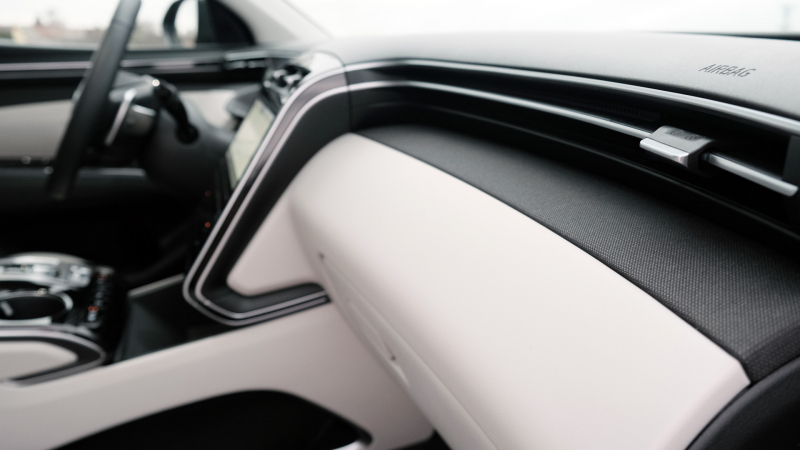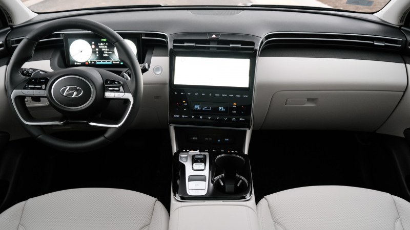 Az utastér egyik újdonsága a 10,25 colos középső érintőképernyő, amely (sajnos) a fizikai vezérlőgombok szerepét is átveszi – szerencsére, ugyan érintőgombokkal, de a klímakonzol megmaradt. A belső hangulatvilágítás 64 különböző szín tízfokozatú fényerőskálán való megjelenítésére képes. A vezetőülésből egy szintén 10,25-ös, teljesen digitális műszerfalra pillanthatunk, a fedélzeti rendszer pedig a Tucson esetében is a Bluelink legfrissebb verzióját kapja meg.
