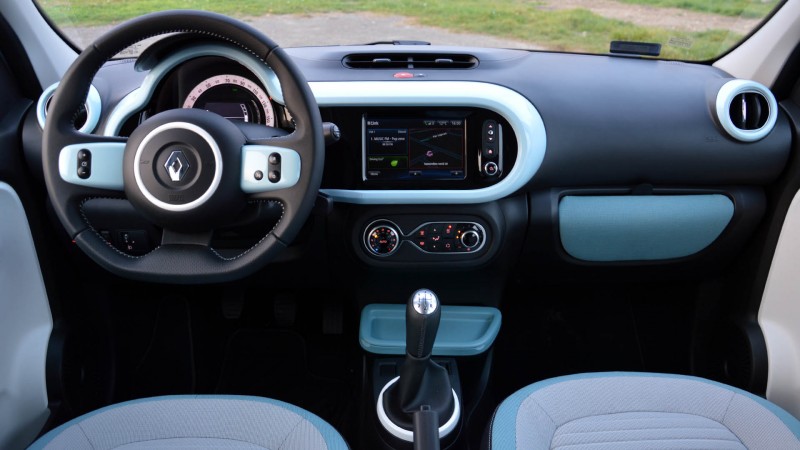 Az utastérben helyet foglalva a tervezők szerencsére nem vetettek véget a jókedvnek. Akármerre fordulunk, biztosan a látóterünkben marad egy színes betét vagy egy ötletes megoldás, melyek minden alkalommal mosolyra fakasztják az embert. Noha ez egy „mindent szemnek, semmit a kéznek” helyzet, a Twingo kategóriájában nem is várhatjuk el, hogy mindent puha anyagokkal borítsanak, hiszen valamin spórolniuk kell a gyártóknak is. Ettől függetlenül néhány helyre kerülhettek volna jobb minőségű matériák is. A műszerfalat és a középkonzolt egybeölelő színes betét igazán jó ötlet, és a kormány formája is felettébb látványosra sikerült, szinte vonzza az ember kezét.