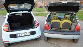 Itt is nőtt a Twingo - galériaA helykínálatot tekintve ismét elismerő szavakkal illethetjük az új Twingót, mely a kissé magas üléspozíció mellett minden irányban elegendő hellyel szolgál az elöl ülőknek. Apropó, a szép, többszínű kárpittal ellátott, kényelmes ülések egyetlen gyengepontja az integrált fejtámla, mely 185 centitől már nem nyújt megfelelő alátámasztást. Az immáron külön ajtókon megközelíthető hátsó sorra szintén nem lehet különösebb panaszunk, habár a kategóriában találkoztunk már nagyobb teret kínáló modellekkel is. 180 centiig azonban még így is bevállalhatunk hosszabb utakat, egyedül a magasra húzott térdekkel és a csak billenthető ablakokkal gyűlhet meg a bajunk a hivatalosan továbbra is csak két személy fogadására képes hátsó paddal kapcsolatban. A csomagtérről már esett szó az előzőekben, de azért jegyezzük meg itt is: az alapból 190 és a hátsó támlákat lehajtva, sík padló mellet 980 literes értékek jónak mondhatók, de közvetlenül a motor fölé hosszabb útra ne tegyünk fagyasztott vagy romlandó dogokat – hiába, a csavarokkal rögzített fedélen található vastag hővédő réteg sem tud csodát tenni.